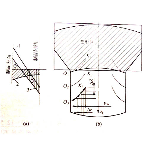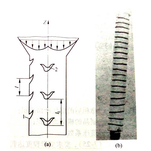 工業鋁型材擠壓速度增快,溫度升高,鋁型材抗拉強度降低;表面金屬疊加后產生的工作拉力和應力時,就會出現裂紋,裂紋的狀態取決于裂紋向深部擴展的速度和鋁型材的流出速度的相互關系;第一條裂紋出現以后,疊加后形成的工作拉應力得到釋放,應力減小,從而使裂紋向深部擴展的速度減慢。若υw為等減速擴展,則每一瞬間裂紋加深值為Δr,而鋁型材以固定速度υ1移動ΔZ值,其結果得到裂紋如圖1所示。當此裂紋擴展到一定深度后,該局部的附加應力消失,裂紋停止發展;隨后金屬又呈周期性的出現裂紋,如圖2所示,直到調整擠壓速度為止。
